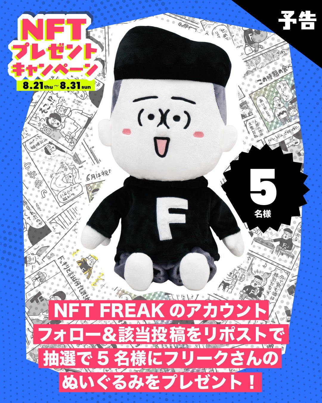 Wチャンス:NFT FREAK公式Xのフォロー&対象投稿をリポストいただいた方の中から抽選で、「フリークさん」ぬいぐるみを5名様にプレゼント。