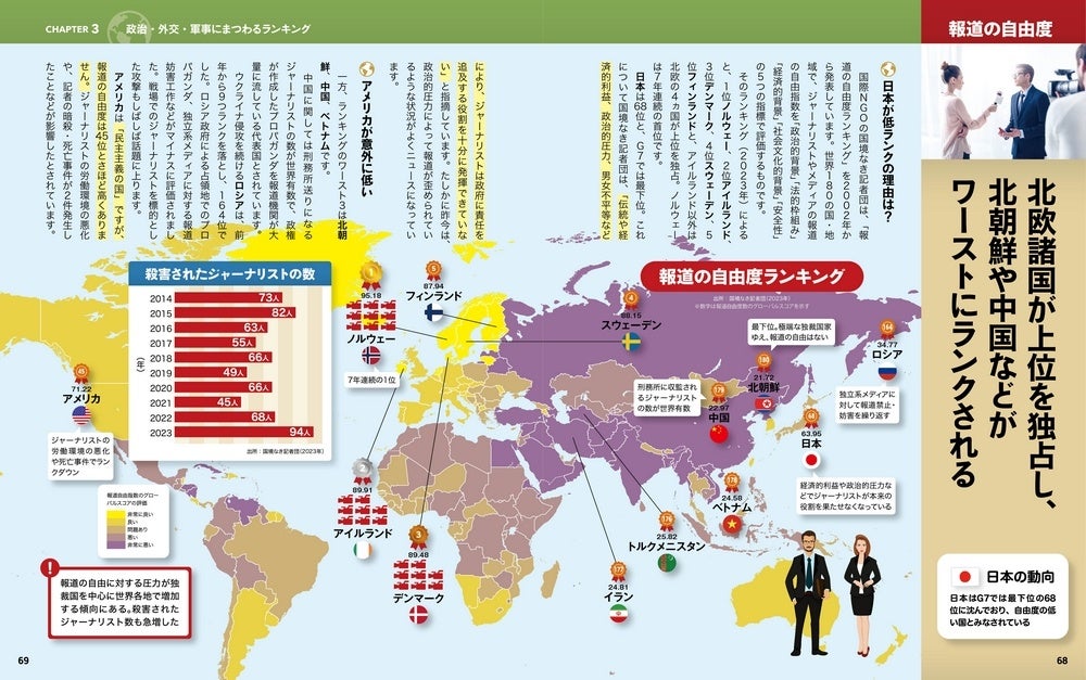 国際NGO「国境なき記者団」が発表している「報道の自由度ランキング」の上位は北欧諸国が独占。日本やアメリカは先進国、民主主義国であるにもかかわらず自由度ランクは高くない。そしてランキングワースト3はアジアの北朝鮮、中国、ベトナム。ウクライナ侵攻を続けるロシアも順位を落としている。