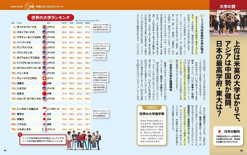 国を支える才能は教育で磨き上げられるため、各国の最高学府の世界ランキングは国力の指標として注目に値する。イギリスの教育誌が発表した2024年の大学ランキングではトップ10を米英の大学が独占、ほか中国の大学が健闘している。日本の東大、京大は年々落ちていたがここにきて復調傾向に。