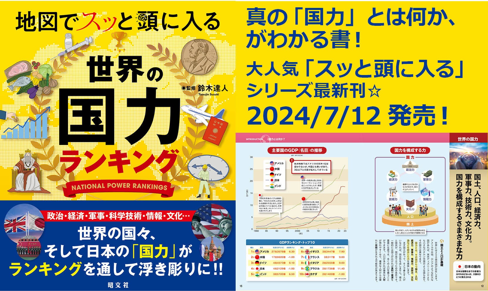 株式会社昭文社ホールディングス(本社:千代田区麹町、代表取締役社長 黒田茂夫、東証コード:9475)とその子会社である株式会社昭文社(本社:千代田区麹町、代表取締役 川村哲也、以下昭文社)は、世界情勢や現代社会の様々な問題、話題をわかりやすく図解で紐解く人気シリーズ「スッと頭に入る」テーマ編の最新刊『地図でスッと頭に入る世界の国力ランキング』を2024年7月12日より発売することをお知らせいたします。
