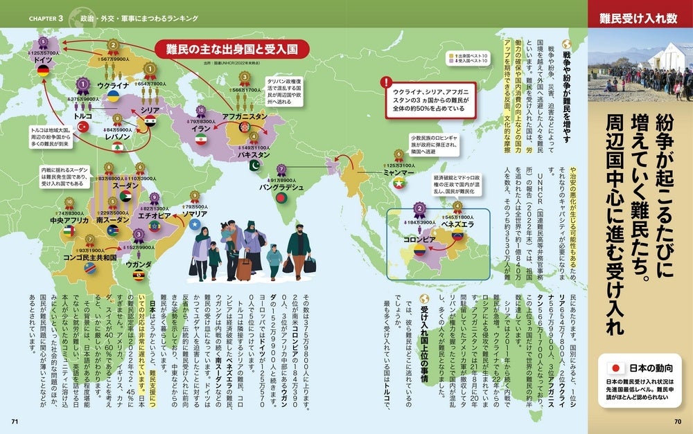 戦争や紛争、災害、迫害などによって国を追われた人々、難民。この難民の受け入れは労働力の確保や国内消費の向上などメリットもあるが、文化的な摩擦や治安の悪化などデメリットもある。難民が多いのはシリア、ウクライナ、アフガニスタンで、受け入れ国はトルコ、コロンビア、ウガンダが上位。かつてユダヤ人を迫害した反省からドイツが5位にランク。日本は難民支援の対応が非常に遅れている。