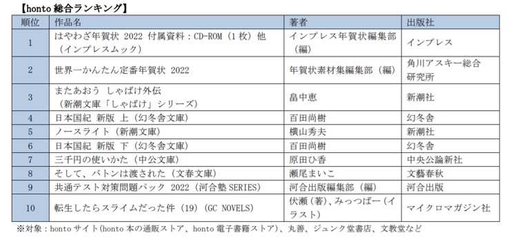 12月のランキングでは、年賀状作成用書籍など新年の準備のための書籍が目立つ結果となりました。今年も皆さまにとって本との素敵な出会いがありますように。2022年もhontoをよろしくお願いいたします。