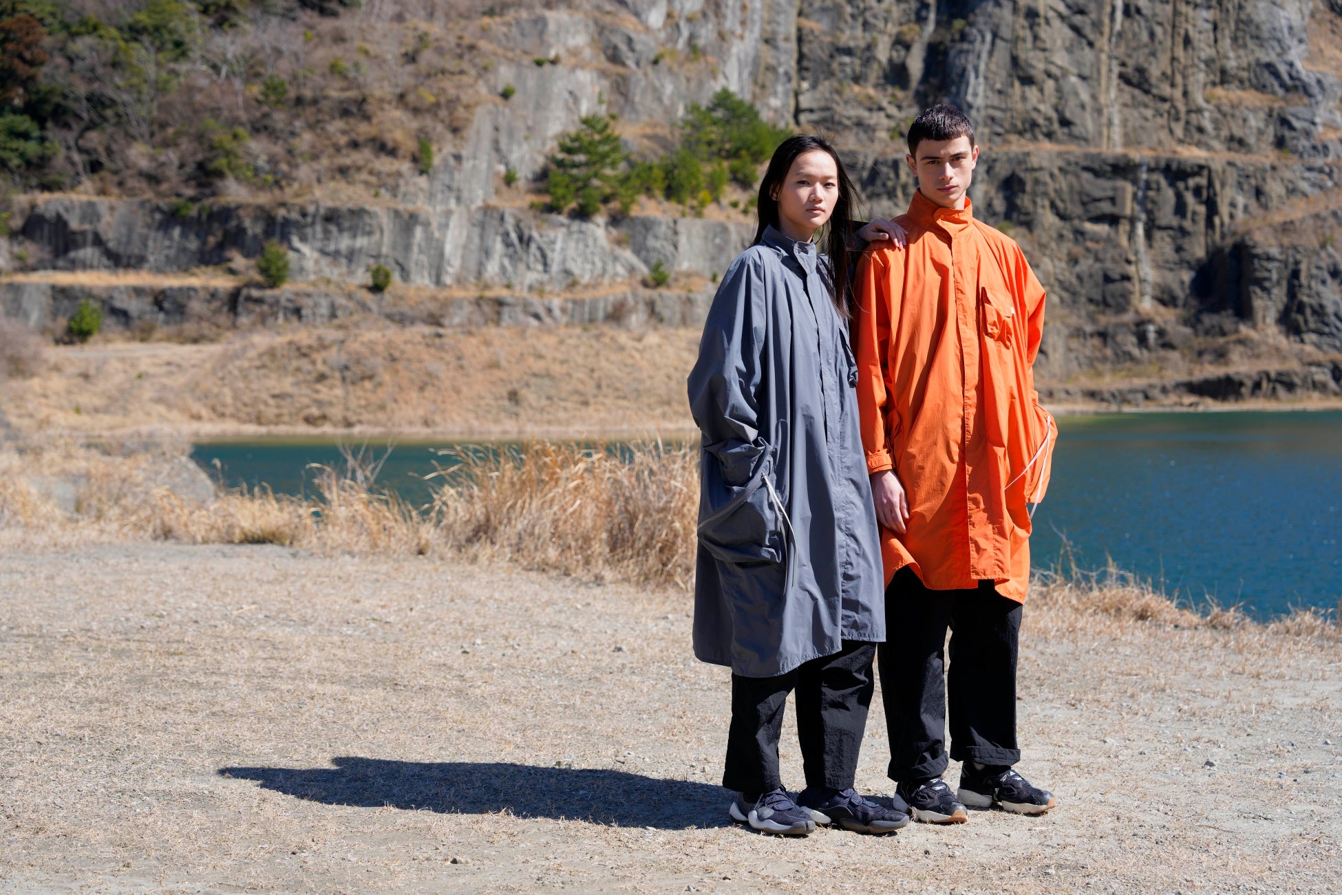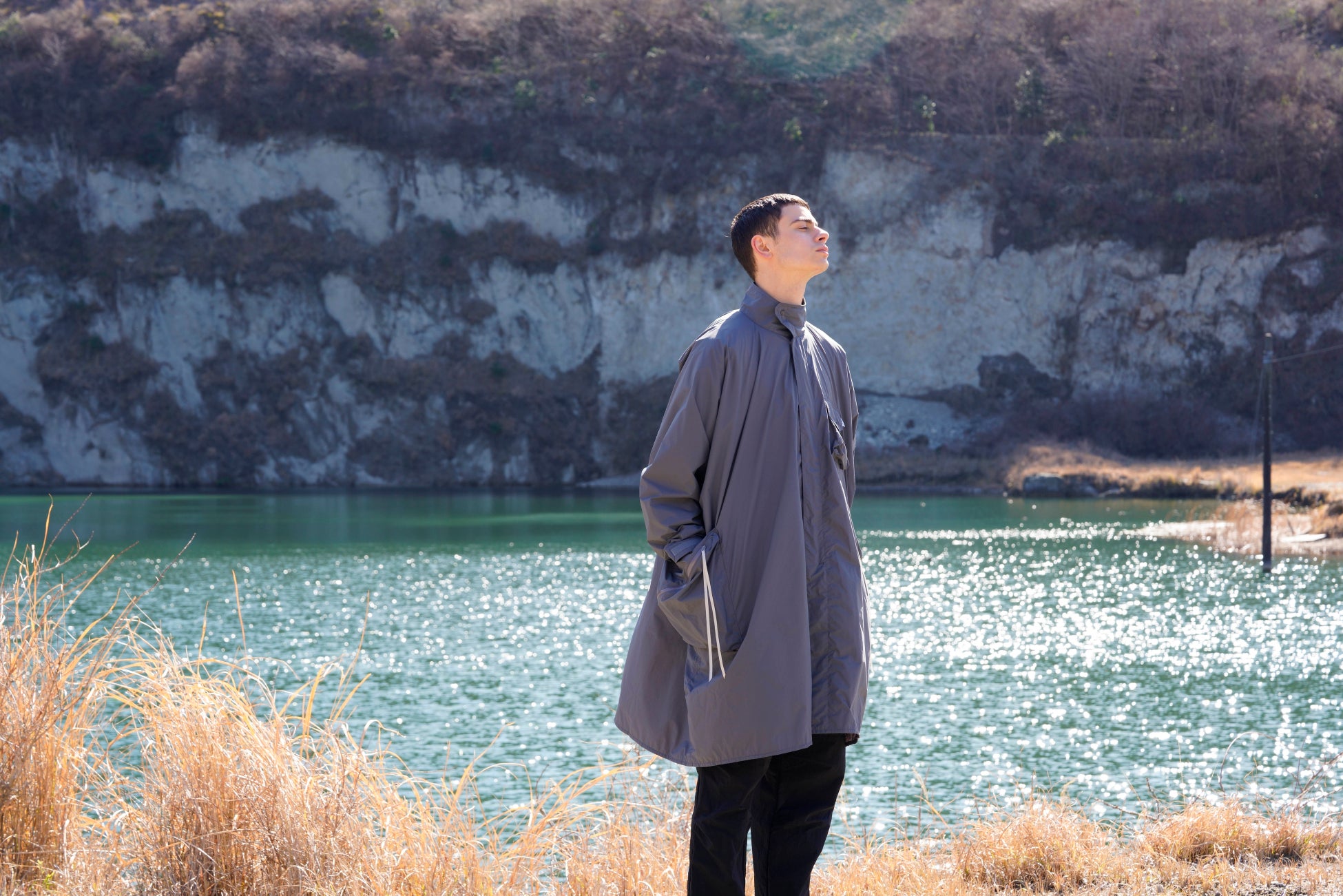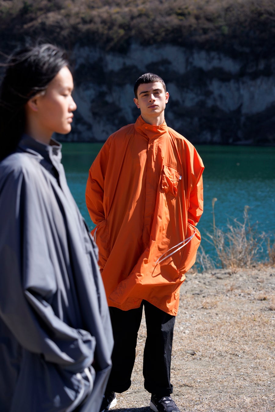 パッカブル仕様・ドルマンスリーブ・大きいマチ付きポケット・グレーテープが特徴。
