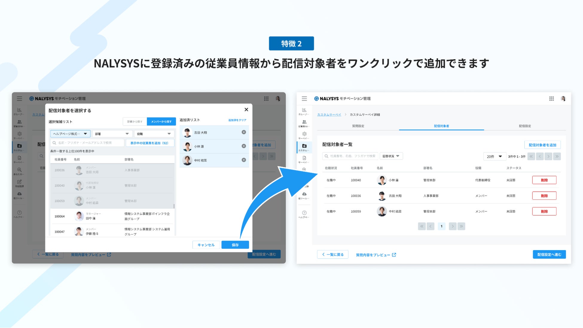 特徴2:NALYSYSに登録済みの従業員情報から配信先をワンクリックで追加できるため、配信先の個別入力は不要です。
