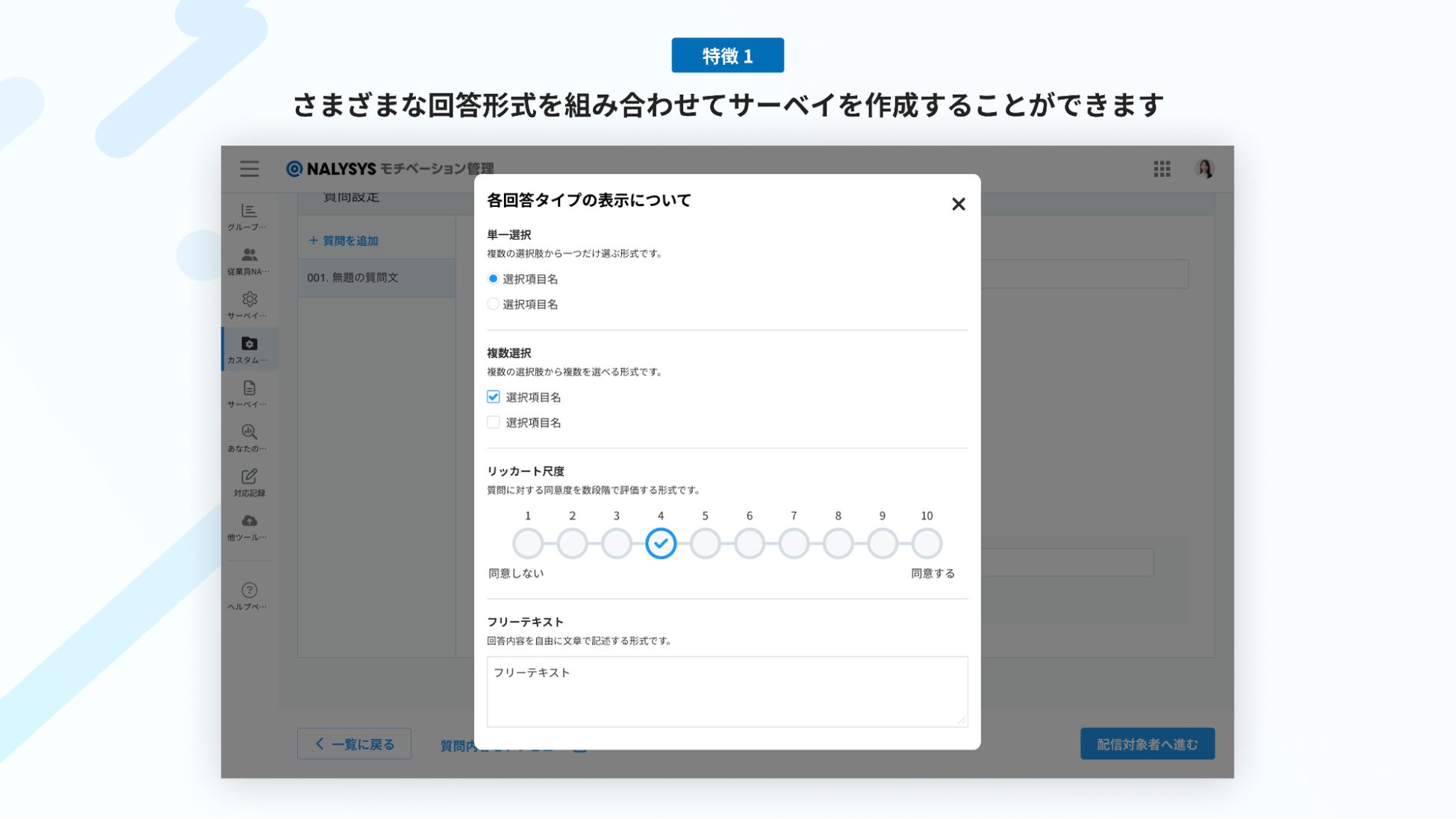 特徴1:さまざまな回答形式を組み合わせてサーベイを作成することができます。