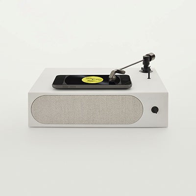 「TurnT」: アプリからの音楽を楽しむためのターンテーブルのようなデバイス。本体上に置いたスマートフォンの画面をレコードの盤面に見立て、針を落とすと再生が始まります。