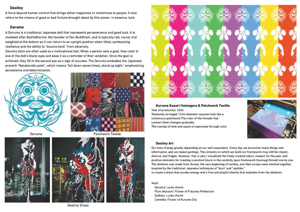 学生が自ら企画した久留米絣のテキスタイルやそれらを用いたドレスなどを展示したり、坂田織物様との取り組みについてプレゼンテーションを行う予定です。