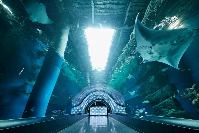 クリスタルとオーロラが迎える神秘的なエントランス。水槽内では銀色に輝く「ヒメツバメウオ」が群れを成して舞泳ぎ、壁に手をかざすと“雪の結晶”が現れるインタラクションな仕掛けも。