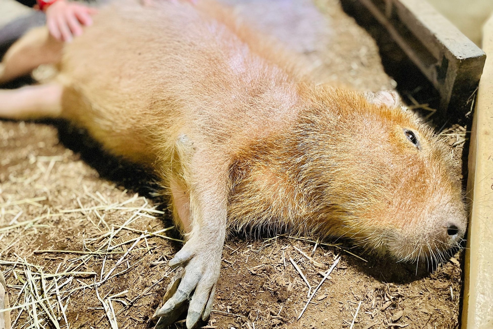 動物たちの負担にならず、積極的に健康管理に協力してもらうためのトレーニング「ハズバンダリートレーニング」。種類や個体毎にさまざまな方法で実施する中、当館のカピバラは地面に寝そべり、リラックスした状態で行います。