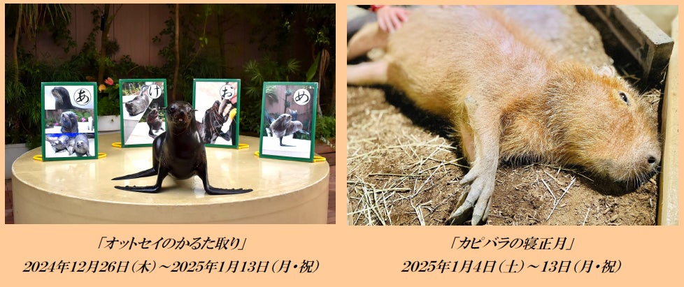 おうちで過ごすだけでなく、小旅行や日帰りレジャーの消費増も期待されることから「スノウアクアリウム」に加え、3つのお正月コンテンツもご用意!“かるた取り”をモチーフに、オットセイの身体能力や生態をお伝えする「ミニパフォーマンス」をはじめ、“寝正月”になぞらえたカピバラのハズバンダリートレーニング※、そして当館初の“体験型福袋プラン”を数量限定で販売します。