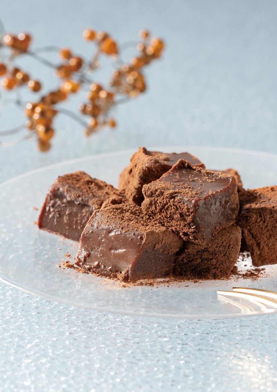 銅釜で丁寧に練り上げたわらび餅にベルギー産チョコレートを混ぜ込み、ココアパウダーをまぶしました。もっちりとほどよい弾力となめらかな口溶けをお楽しみください。