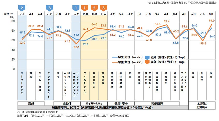 学生が関心を向ける開示項目(※7)について、性別による差を確認したところ、相対的に、男性は「リーダーシップ」「サクセッション(後継者プラン)」「エンゲージメント」への関心が高く、女性は「ダイバーシティ」「差別のなさ」「育児休暇」への関心が高かった。
