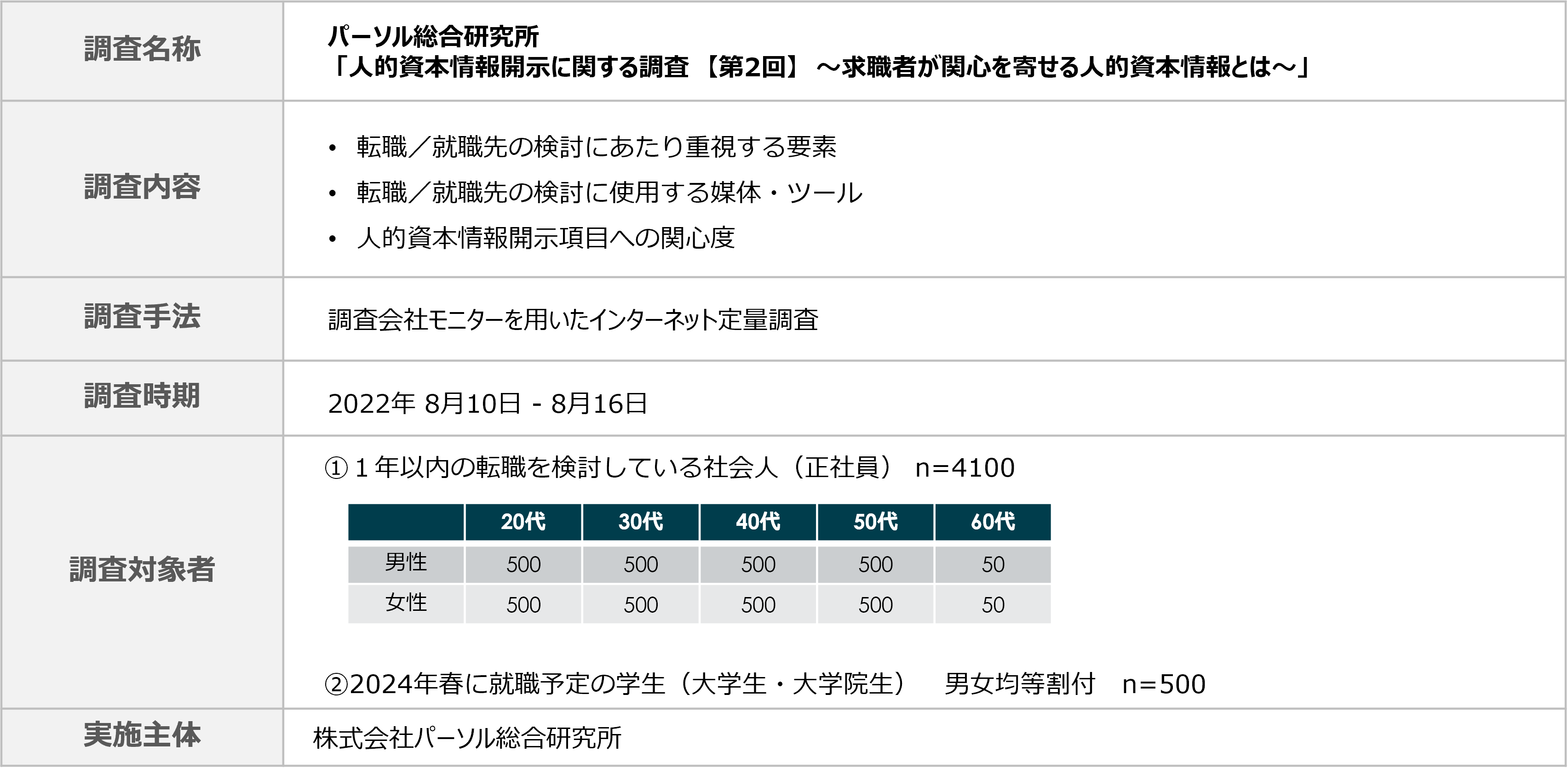 株式会社パーソル総合研究所(本社:東京都港区、代表取締役社長:萱野博行)は、人的資本情報開示に関する調査結果を発表いたします。本調査は、転職を検討している社会人、および2024年春に就職を予定している学生が、企業のどのような人的資本情報に関心があるかを定量的に把握することにより、経営・人事に資する提言を行うことを目的に実施しました。