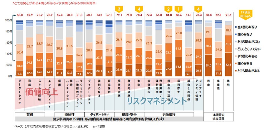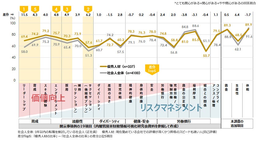 また、「人的資本可視化指針」において19項目に対し示されている「価値向上」「リスクマネジメント」の2つの観点から見ると、社会人全体では「リスクマネジメント」領域に関心が高い傾向があるのに対し【図表2の黄色囲み数字参照】、優秀人材は社会人全体に比べ「価値向上」領域に関心が高い傾向が見られた【図表3の黄色囲み数字参照】