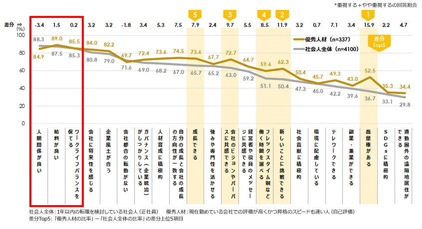 また、現在勤めている会社での自己評価を聞く質問項目を設け、「評価が高い」かつ「昇格のスピードが速い」と回答した人を「優秀人材」として分析に用いた。優秀人材と社会人全体の結果を比較したところ、優秀人材のほうが相対的に「裁量権がある」「新しいことに挑戦できる」「会社のビジョンやパーパスに共感できる」「フレックスタイム制など働く時間を選べる」「成長できる」といった要素をより重視する傾向が見られた【図表1の黄色囲み数字参照】。