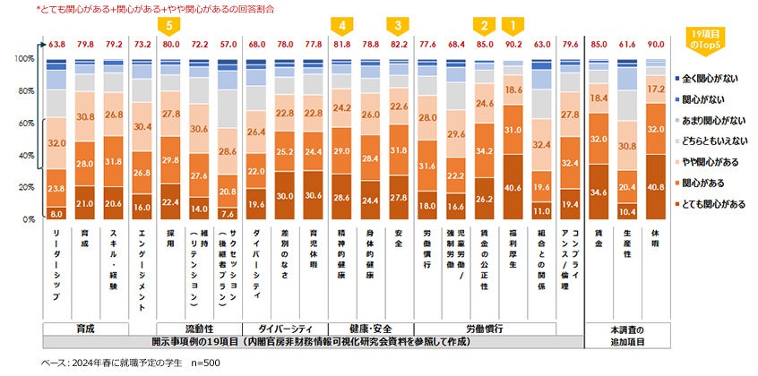 学生に関心のある人的資本情報の開示項目(※6)を聞いたところ、関心の高かった項目の1位・2位は「福利厚生」(90.2%)、「賃金の公正性」(85.0%)と、社会人と同じ項目がトップ2として挙がった。3位以降は、「安全」(82.2%)、「精神的健康」(81.8%)、「採用」(80.0%)が続いた。また、19項目以外に聞いた「休暇(育児休暇にとどまらず休暇全般)」(90.0%)や「賃金(公正性にとどまらず賃金全般)」(85.0%)も、社会人の結果と同様、関心が高かった。