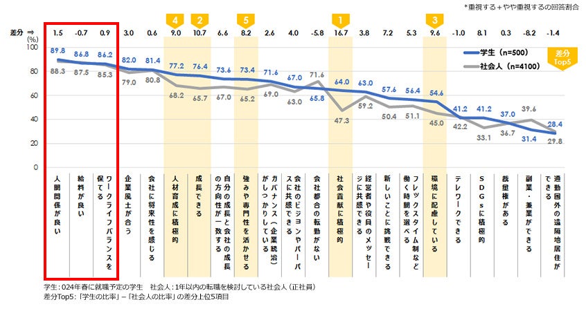 次に、2024年春に就職を予定している学生(大学生・大学院生)500人に、就職先の検討にあたり重視する要素(※5)を聞いたところ、上位3つは「人間関係が良い」(89.8%)、「給料が良い」(86.8%)、「ワークライフバランスを保てる」(86.2%)であり、社会人の上位3つと同じ結果となった【図表5の赤枠参照】。