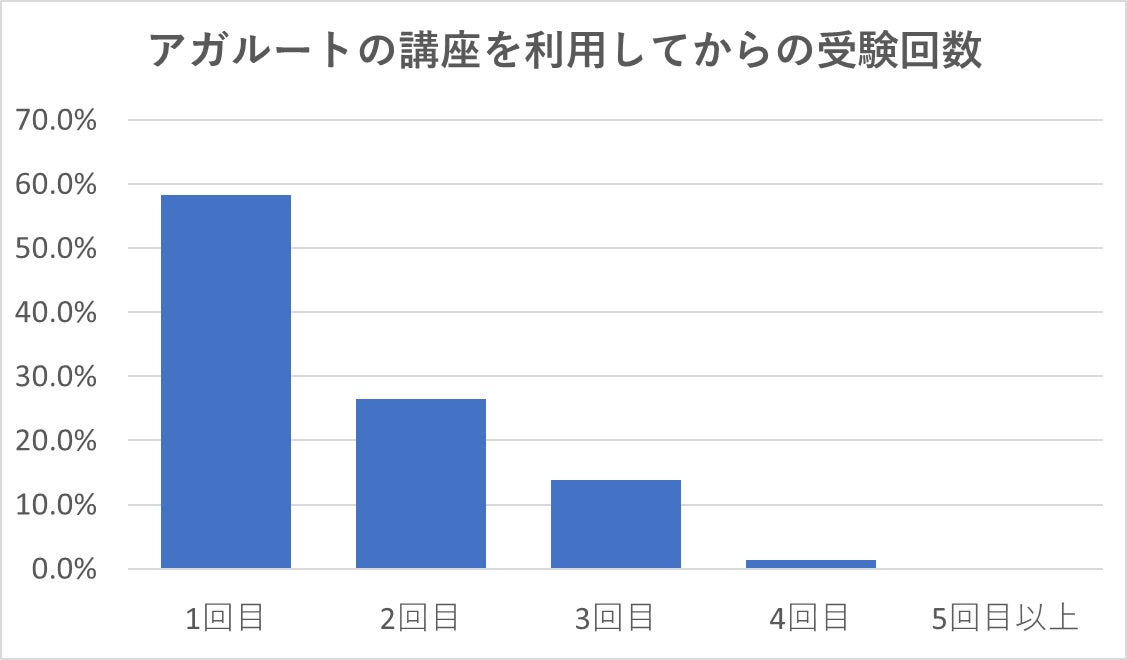 なお、令和6年度社会保険労務士試験に合格した受験生のなかでアガルートの講座を利用してからの受験回数は、1回が58.3%で最多、次点が2回の26.4%となっており、2年目までの学習で84.7%の受講生が合格しています。
