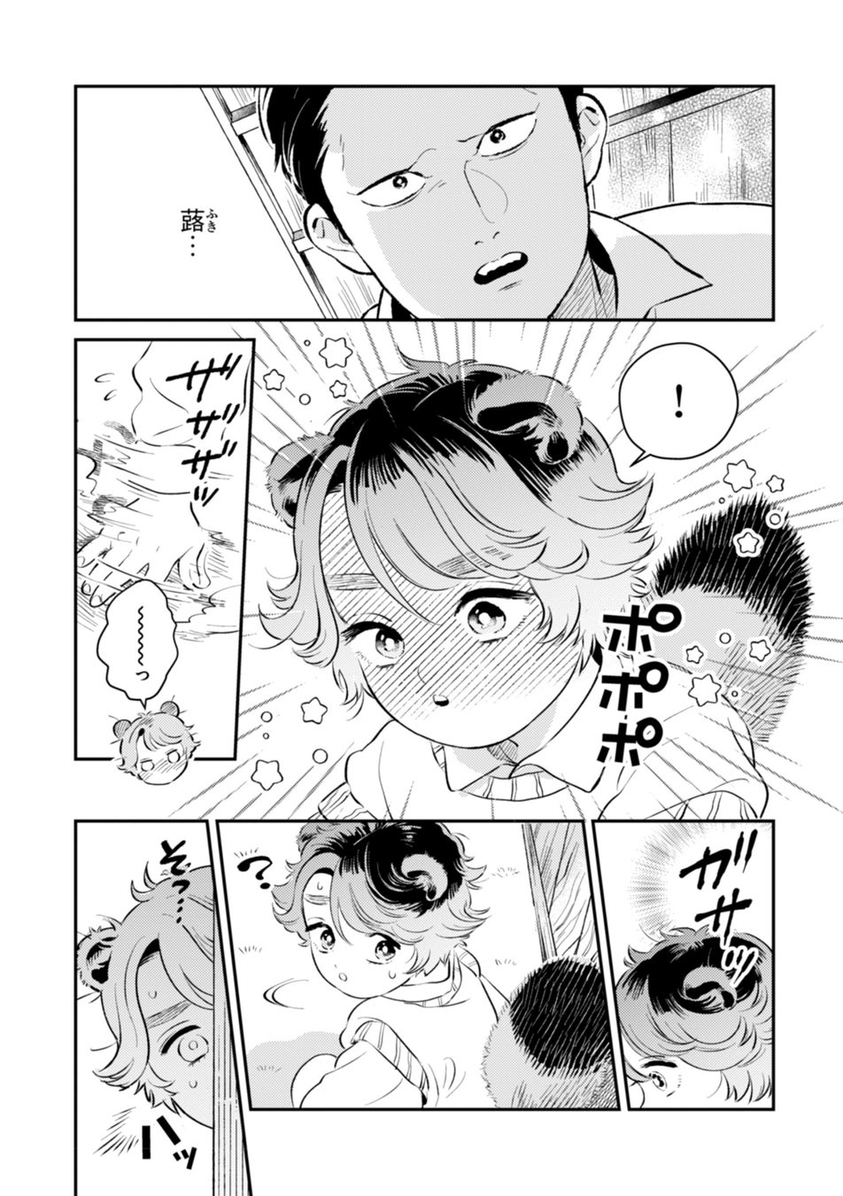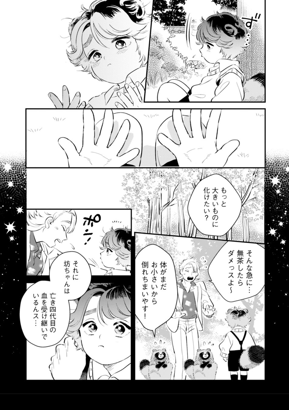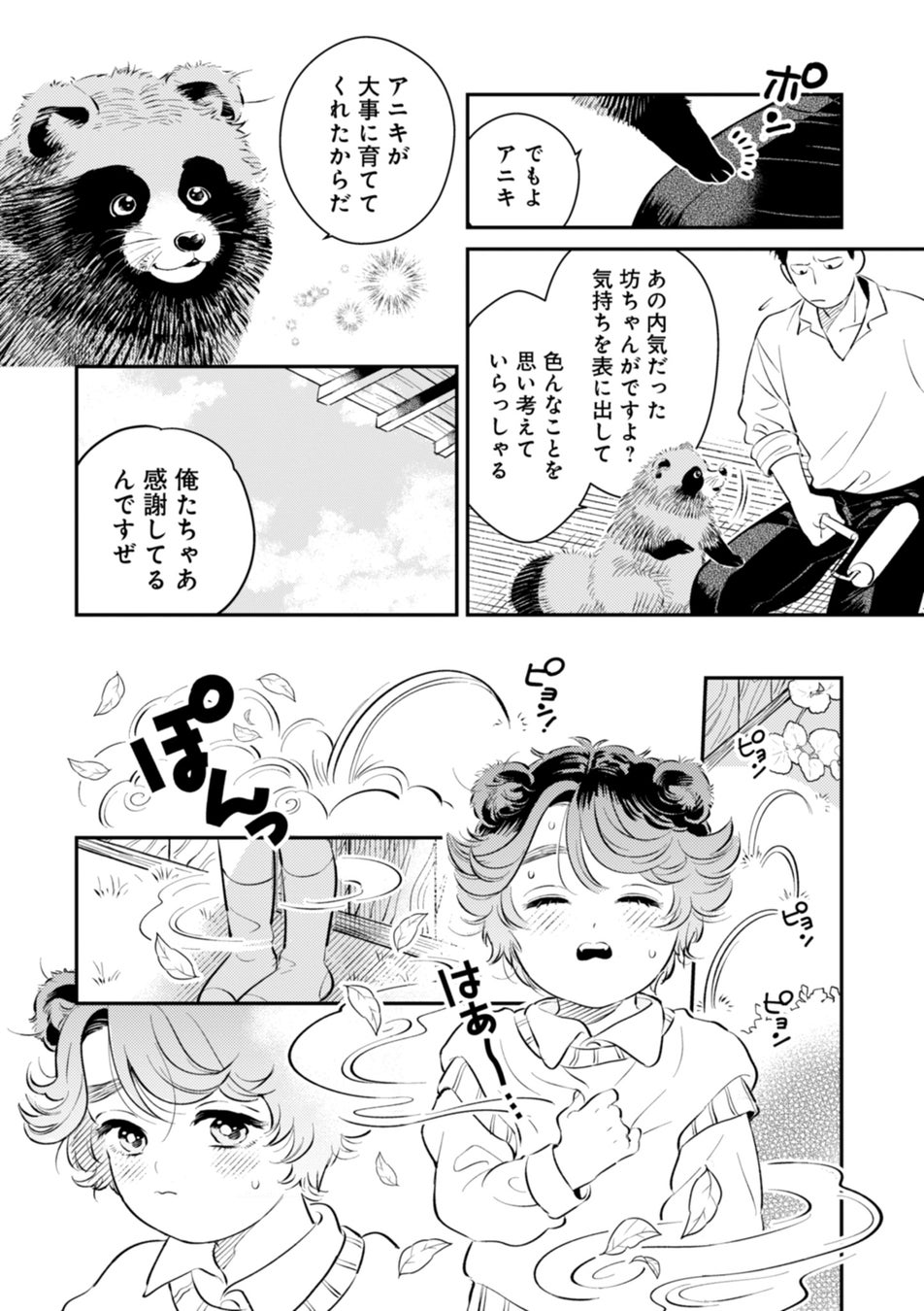 普段は耳としっぽが出たままで過ごし、完全な人間にもたぬきにも化けられない、まだまだ頼りない子供。