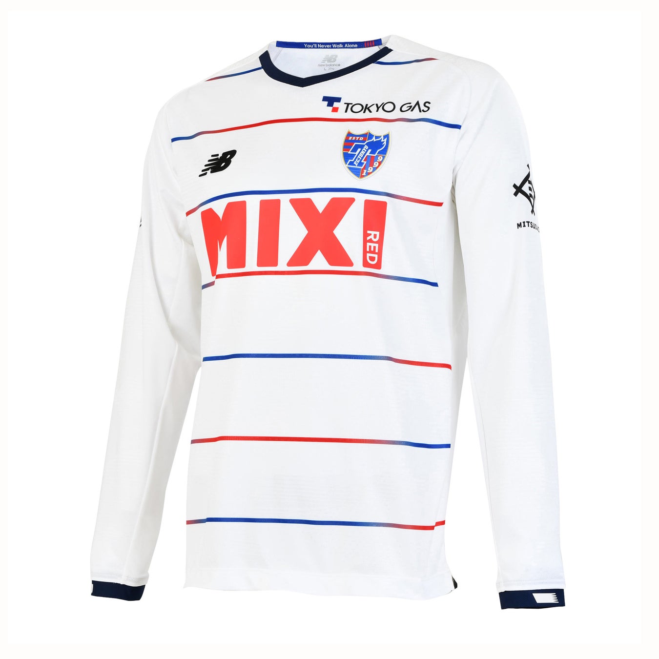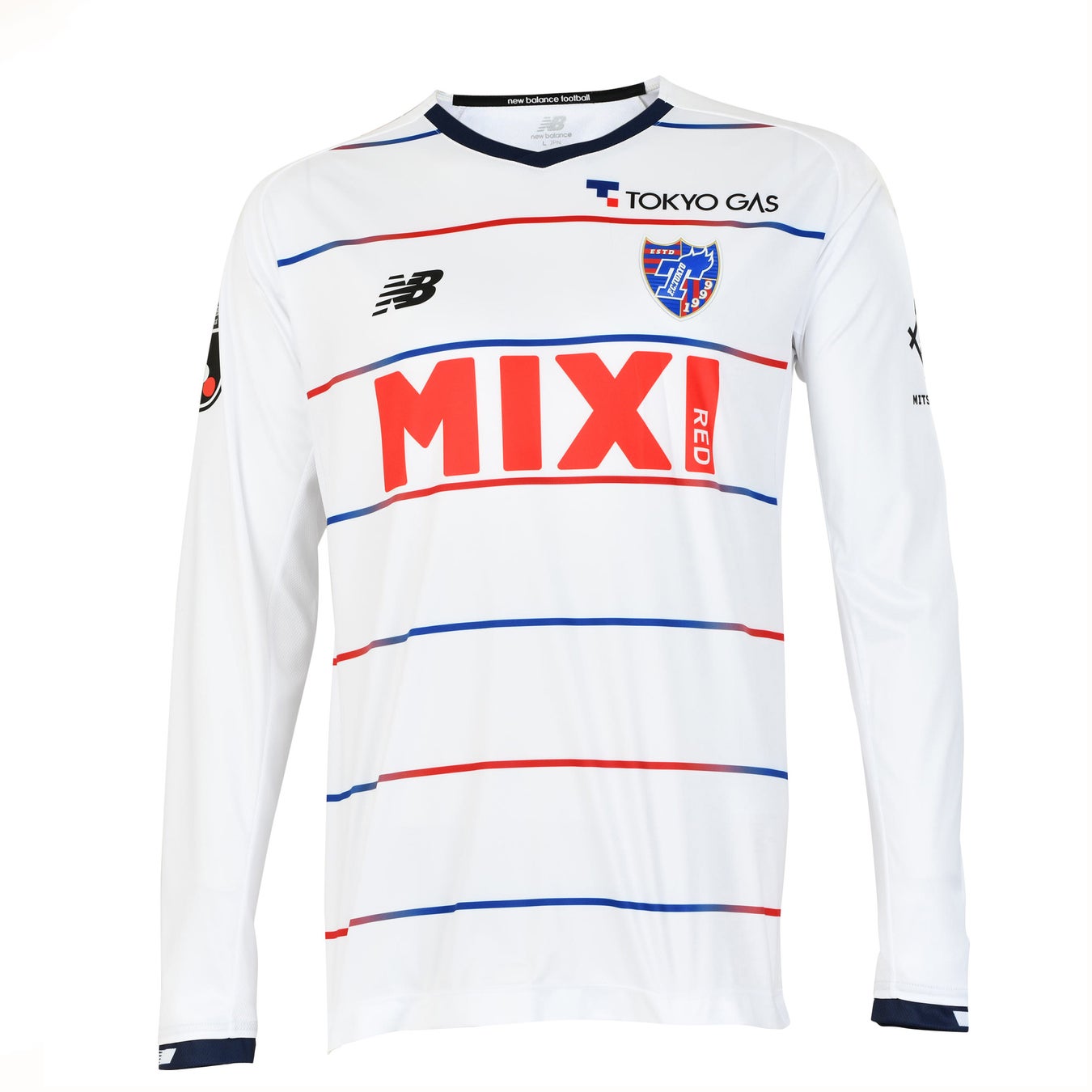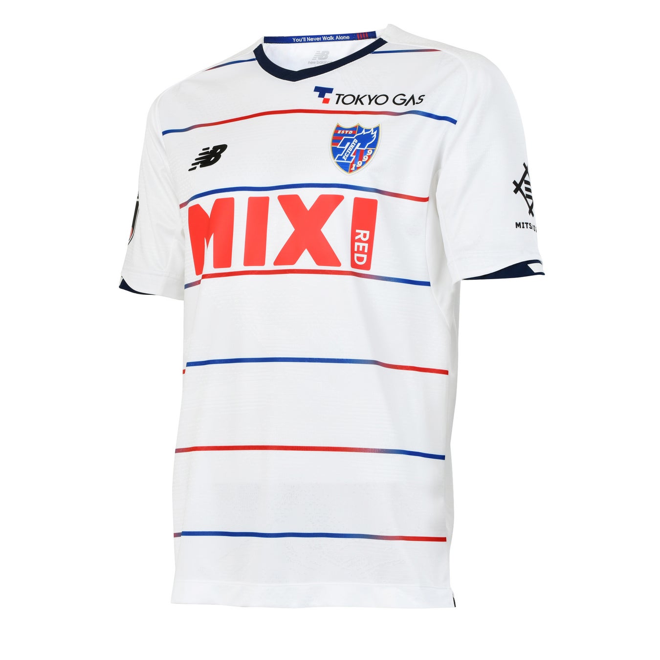 アウェイユニフォームは、引き続きホワイトを採用。青から赤に変わるピンストライプは味の素スタジアムのLED照明からインスパイアされています。首元と袖はネービーのトリミングで仕上げています。