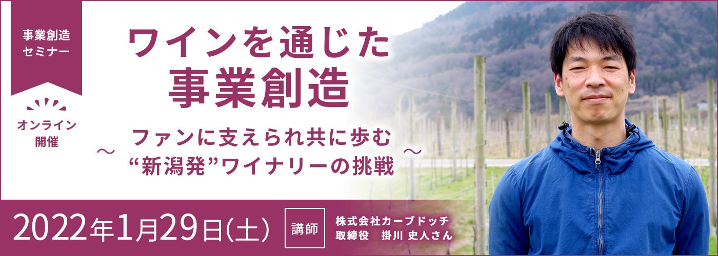 ワイン未開の新潟を世界に誇るワイン産地とするという大きな挑戦から始まったカーブドッチ。今回は人気と実力を兼ね備えたワイナリー「カーブドッチ」の醸造長である掛川 史人氏による「ワインを通じた事業創造~ファンに支えられ共に歩む“新潟発”ワイナリーの挑戦」と題した事業創造セミナーを開催します。