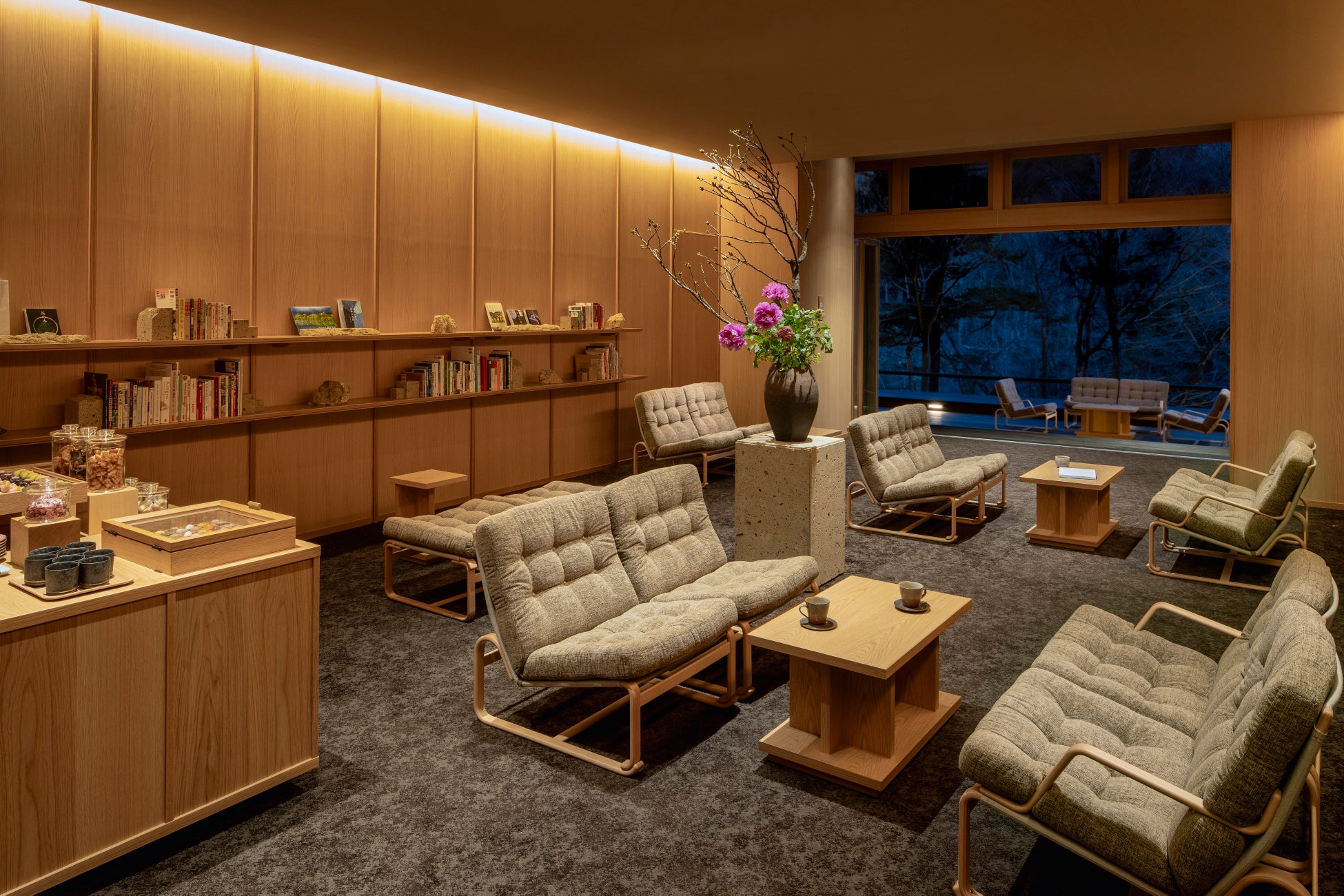 館内の渓流に面した空間には「せせらきラウンジ」を配しました。足湯付きのテラスを併設しており、名取川に面して四季の風景を楽しめる空間です。「せせらき」という言葉は、せせらぎの古語で浅瀬に水が流れる音を表します。また「瀬々(せせ)」という言葉には、「浅瀬」という意味以外にも、「その時々」という意味があります。古くは伊達政宗公も和歌で詠んだ言葉で、渓流の音や自然の空気、またその時々の季節を感じてほしいという思いを込めました。