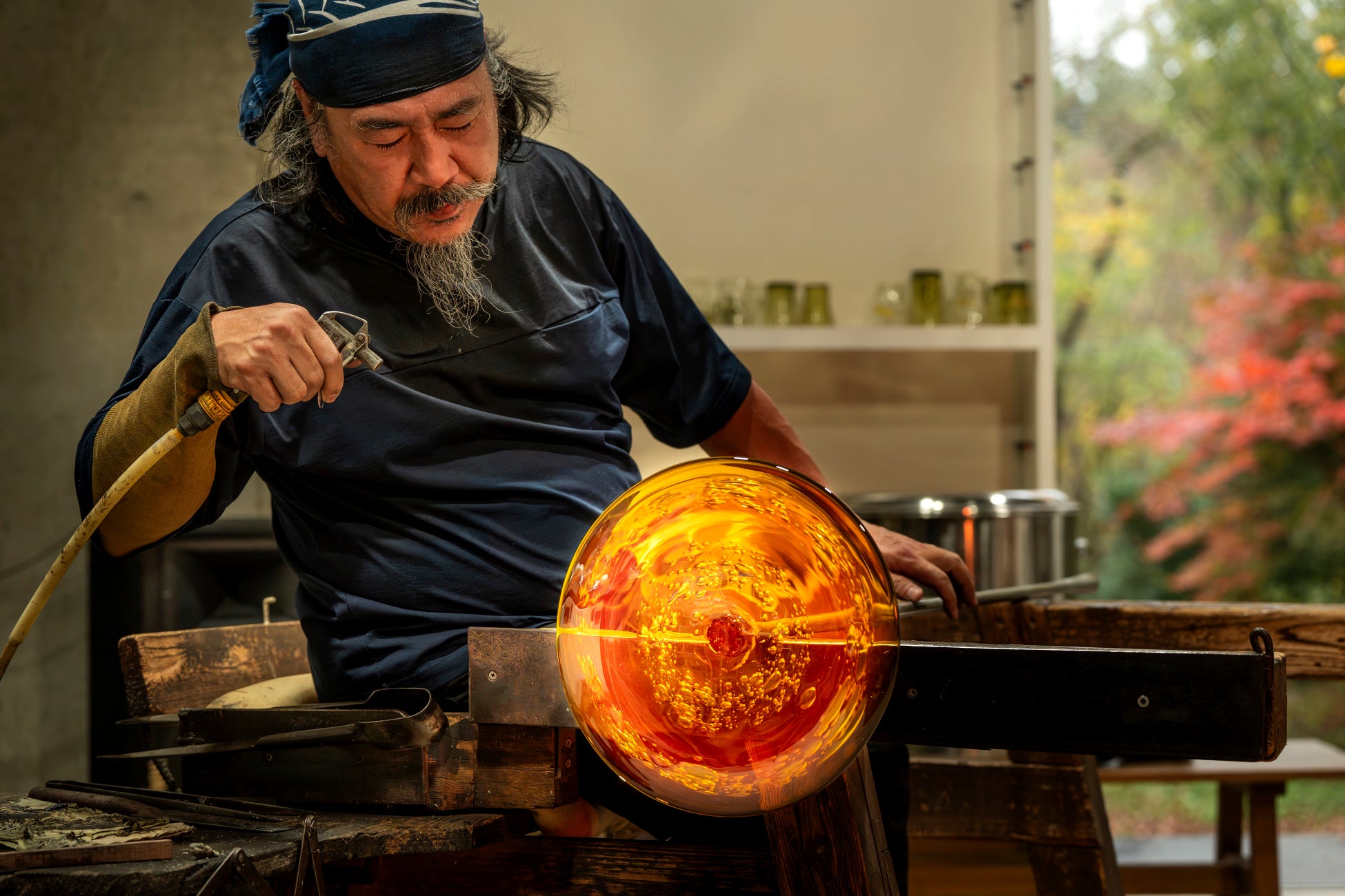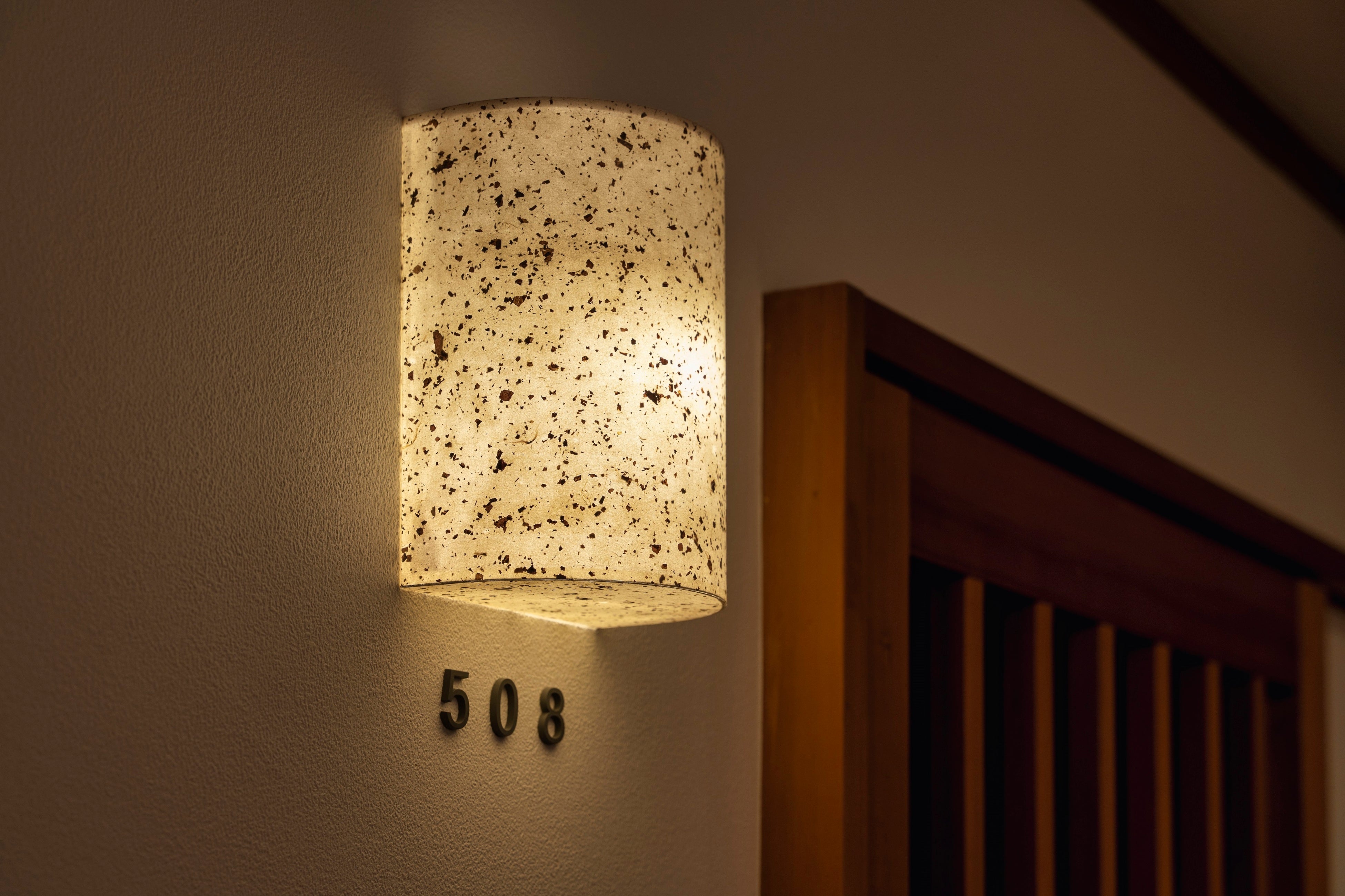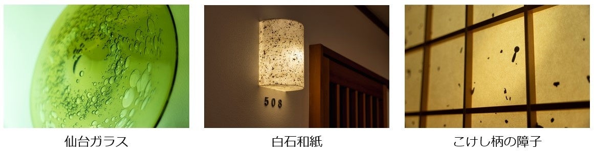 客室のアートは、秋保に工房を構える「海馬(かいば)ガラス工房」の村山 耕二氏に制作いただきました。江戸時代に仙台の城下町でつくられ、その後一度技術が途絶えたといわれる仙台ガラス。村山氏は研究を重ねてそのガラスを再現し、その後もさまざまな材料を使ったガラス素材の研究、および造形物の企画・デザイン・制作を手掛けています。仙台市内を流れる川の砂を原料とし、杜の都と呼ばれる自然豊かな仙台を象徴するような、美しい緑色が特徴です。光を受けて輝くアートで、川のせせらぎ、水面のきらめきを表現しました。