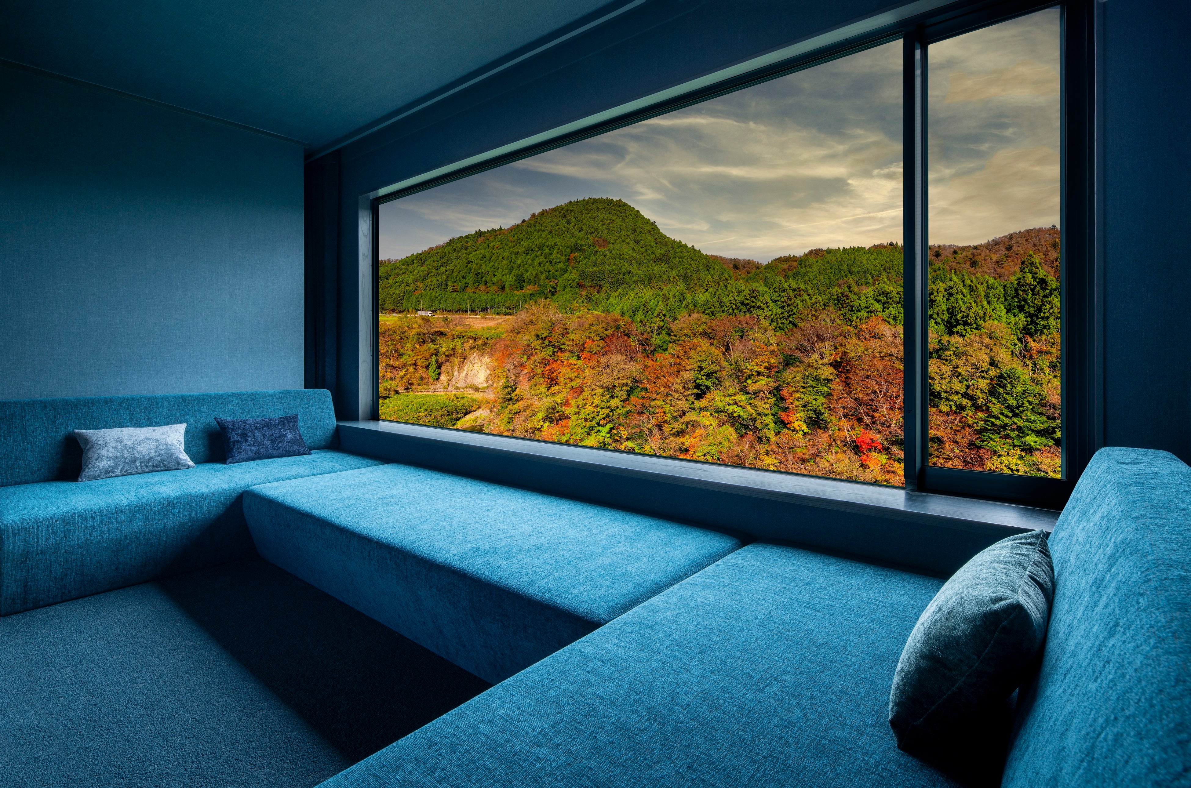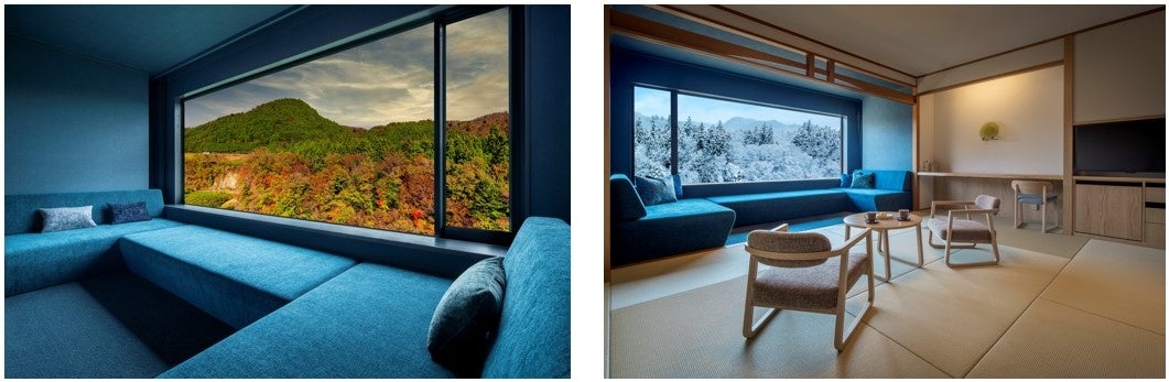「界」では、地域の文化に触れるご当地部屋を用意しています。界 秋保のご当地部屋は「紺碧の間」です。秋保温泉の景勝地である、名取川の峡谷「磊々峡(らいらいきょう)」が、かつて「紺碧の深淵」と表現されたことから着想を得ています(*2)。まるで紺碧色のフレームで切り取られたかのように、外に広がる四季の景色や渓流を楽しめます。また客室のデスクには、「仙台ガラス」のアートを配します。ゲストを出迎える部屋番号の札には、江戸時代から続く伝統工芸品の「白石和紙」を用い、寝室の障子にはこけしの柄が隠れているなど、宮城のご当地の要素を取り入れたしつらえにも触れるひとときを過ごせます。