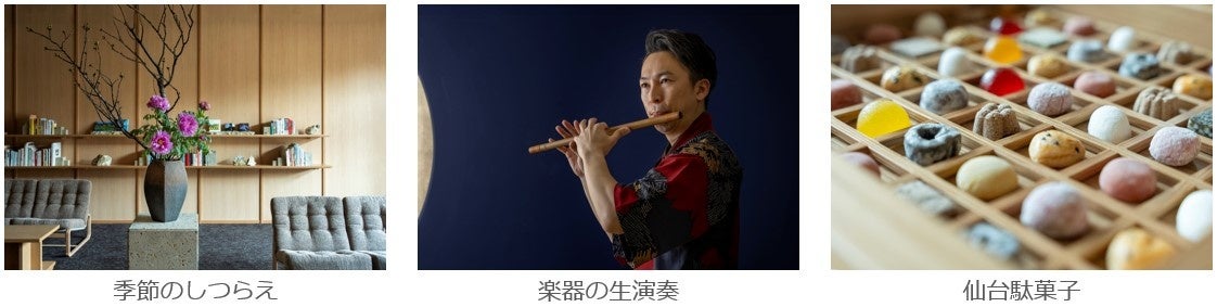 伊達政宗公は、海外から花を持ち帰ったり、訪れた場所で気に入った花を取り寄せ育てたりと、日常的に草花を愛でていました。加えて客人へのもてなしとして、飲食や能、時には自身で小鼓をたたいたといわれています。そこから着想を得て、「せせらきラウンジ」では春には牡丹や藤、夏には白萩など、伊達政宗公にゆかりのあるものも交えた花のしつらえが空間を彩ります。また、毎晩奏でられる楽器の生演奏に耳を傾けながら、地元のワイナリーのワインや季節のドリンク、仙台藩の時代から続く「仙台駄菓子」など、その季節の趣向で用意する飲み物やお菓子を片手に、ゆっくりと自然に浸るひとときを提案します。