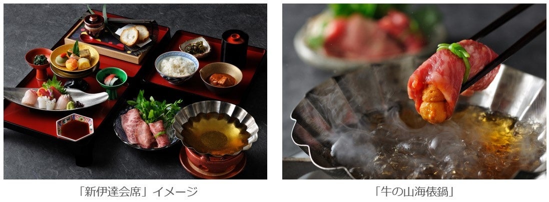 夕食は、プライベート感が保てる半個室のある食事処で、ご当地の食文化を生かした会席料理を提供します。界 秋保の夕食は、牛テールと仙台味噌をリエットにした先付けから始まります。宮城県の名産である仙台麩にリエットをつけて味わう一品です。戦国武将、伊達政宗公が着用していたといわれる、水玉模様の陣羽織の柄を器に取り入れました。先付けや、酢の物・八寸・お造りを一緒に盛り合わせた「宝楽盛り」は、大名の食事をイメージした脚つきのお膳にのせて提供します。そして特別会席の小鍋は「牛の山海俵鍋(さんかいたわらなべ)」。宮城県は豊かな自然に囲まれた立地で、海の幸はもちろん、山の幸も豊富な地です。宮城県が米どころでもあるところから着想を得て、俵をかたどった牛肉をトリュフを浮かべた出汁にくぐらせ、雲丹を添えて楽しむ一品です。牛タン、せりなど、宮城らしい食材とともに味わいます。