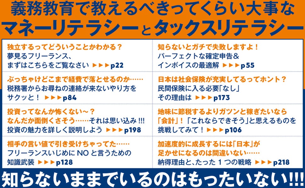 間違える人続出の「確定申告と節税対策」から、「何のことですか?」じゃあビジネスが成り立たない「インボイス制度」、必ず知っておきたい「フリーランス保護法」、とっつきにくい「会計知識」、ガチで稼ぎたい人のための「経営分析、営業戦略」、ラスボス「老後資金」問題を攻略する「NISA&iDeCo」まで……駆け出しフリーランスがつまずく悩みをしっかり解消、貧乏フリーランスのよくある間違いをがっつり解説。