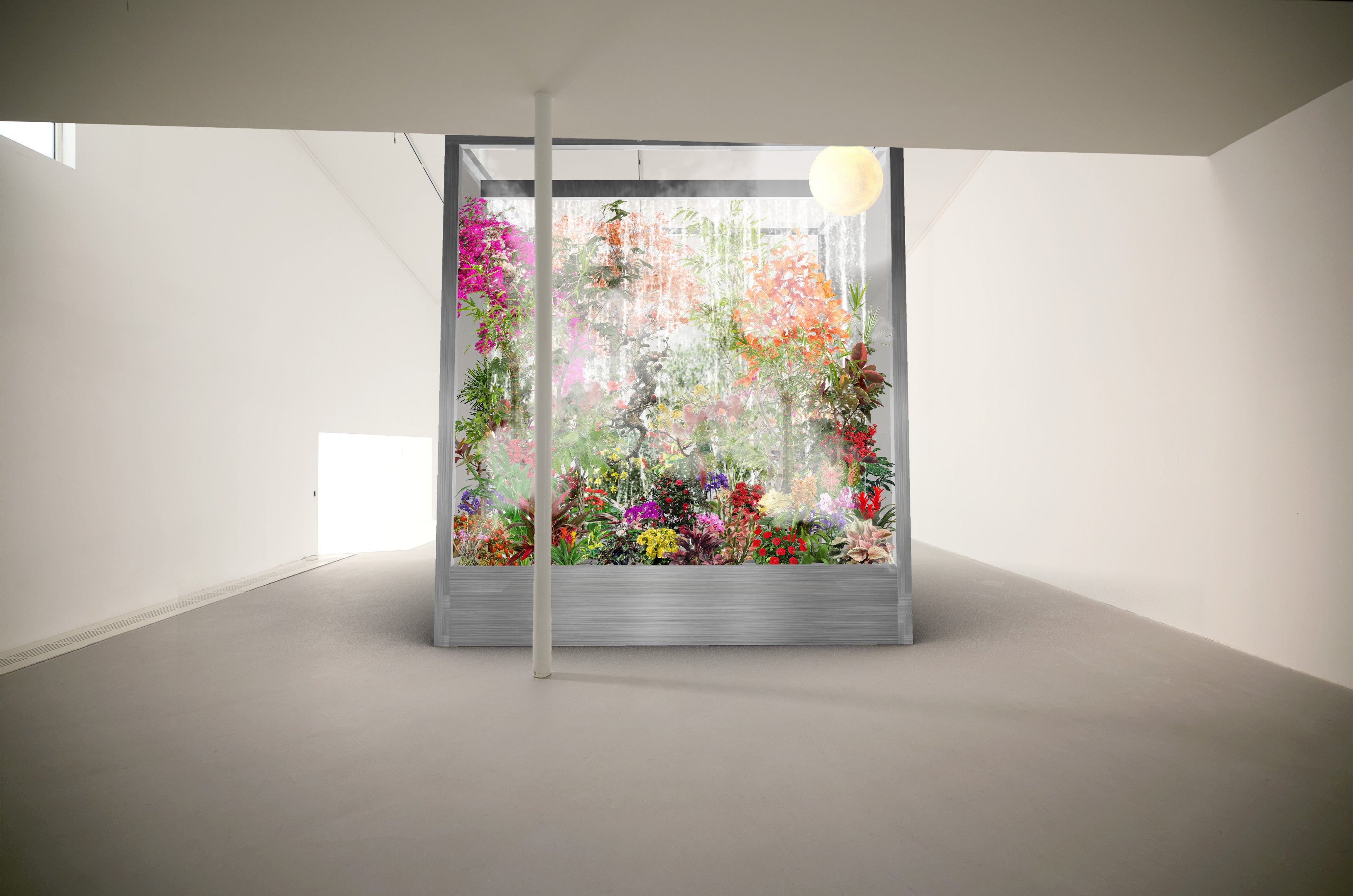有機的な自然が四角く切り取られ、人工的な境界線の中に小さな自然が現れるー 切り取られた 「自然」の内部では、植物がゆっくりと呼吸し、芽を出し、花を咲かせ、生命の循環を静かに繰り返します。