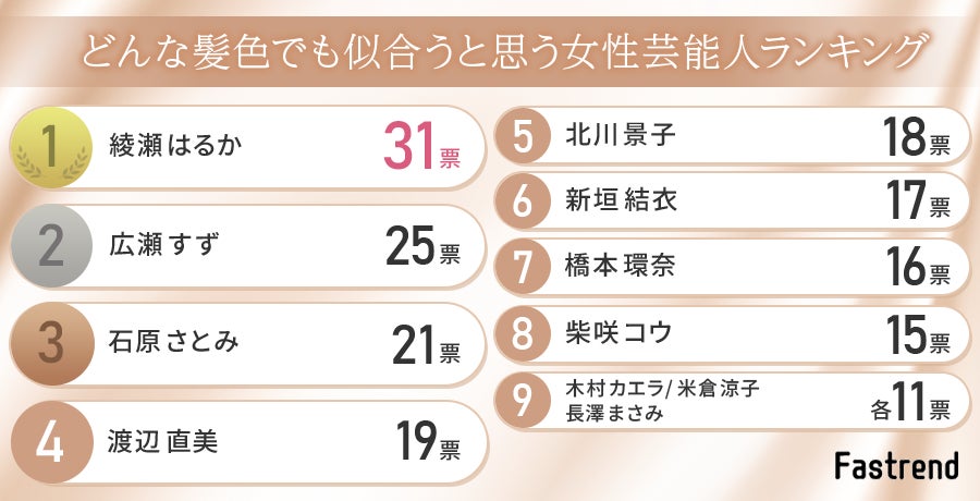 ファストレンド(運営会社:株式会社NEXER)は、「どんな髪色でも似合うと思う女性芸能人」に関するアンケートを実施し、結果をサイト内にて公開したので紹介します。