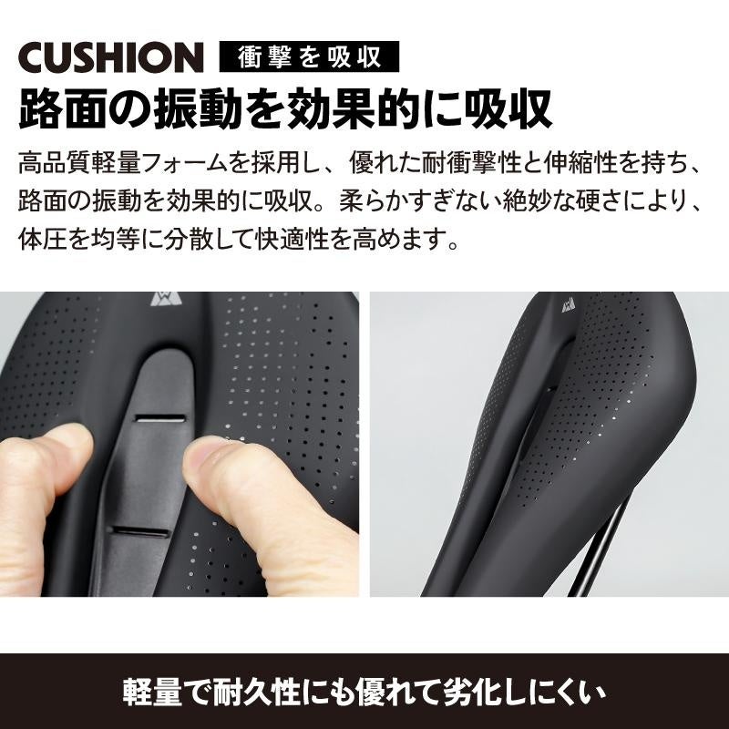 高品質軽量フォームを採用したサドルは、適度な厚みと軽量さを両立し、