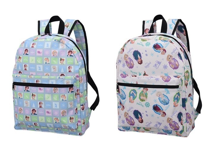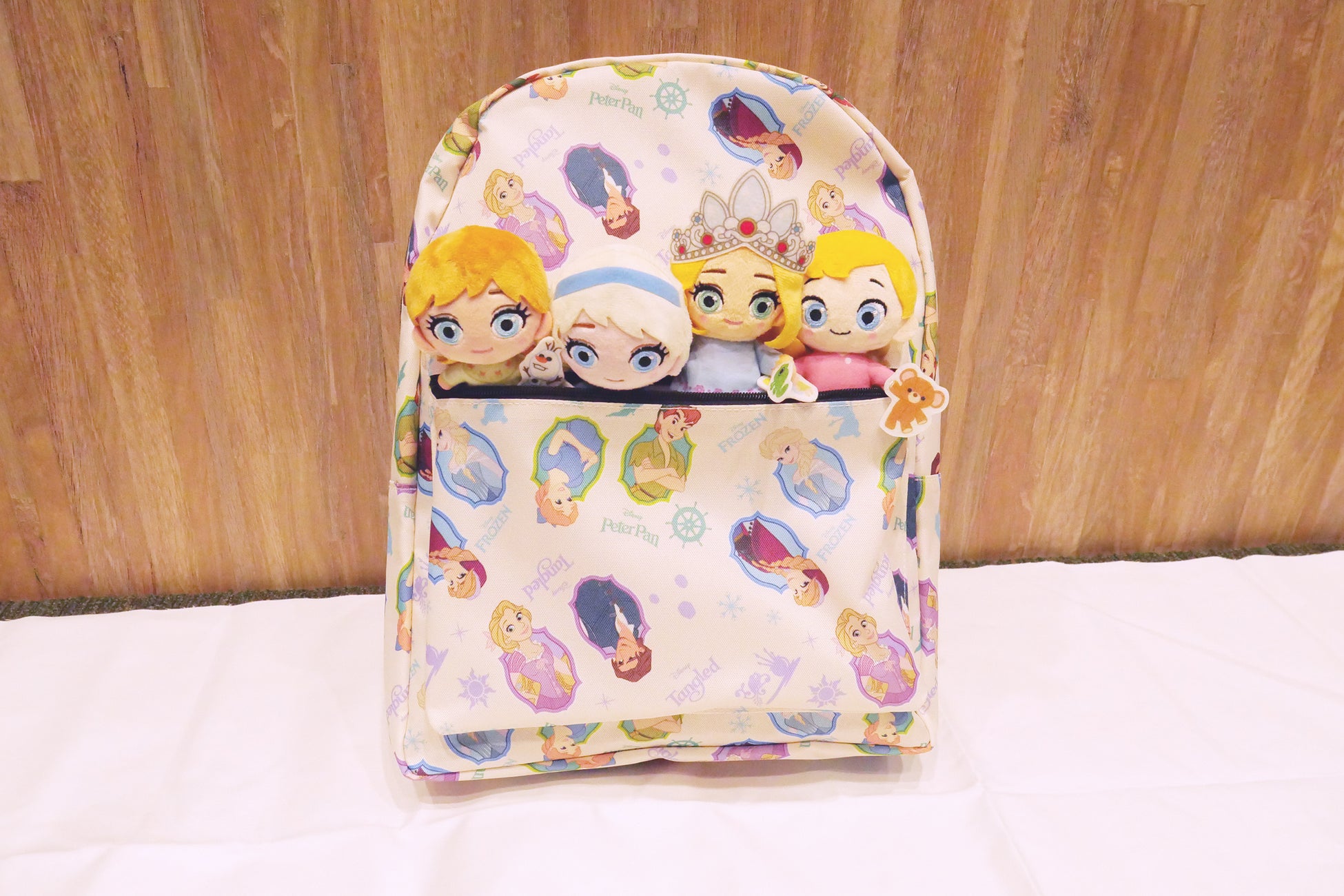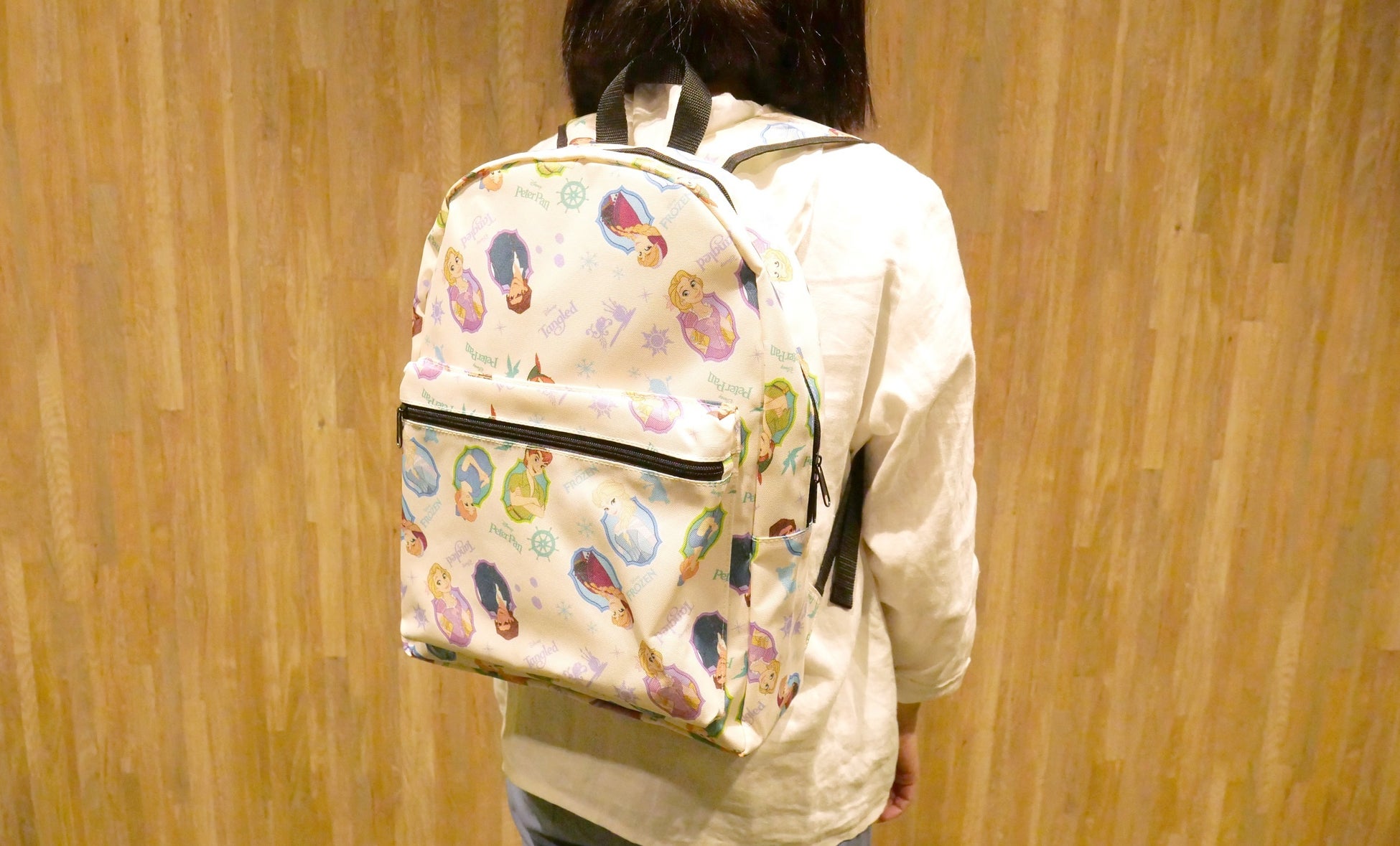 『アナと雪の女王』『塔の上のラプンツェル』『ピーター・パン』に登場するキャラクターが描かれたラウンド型のリュック。