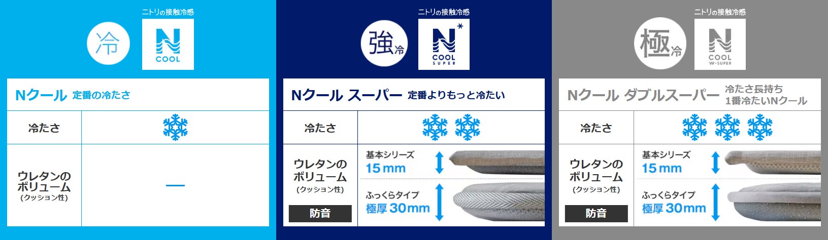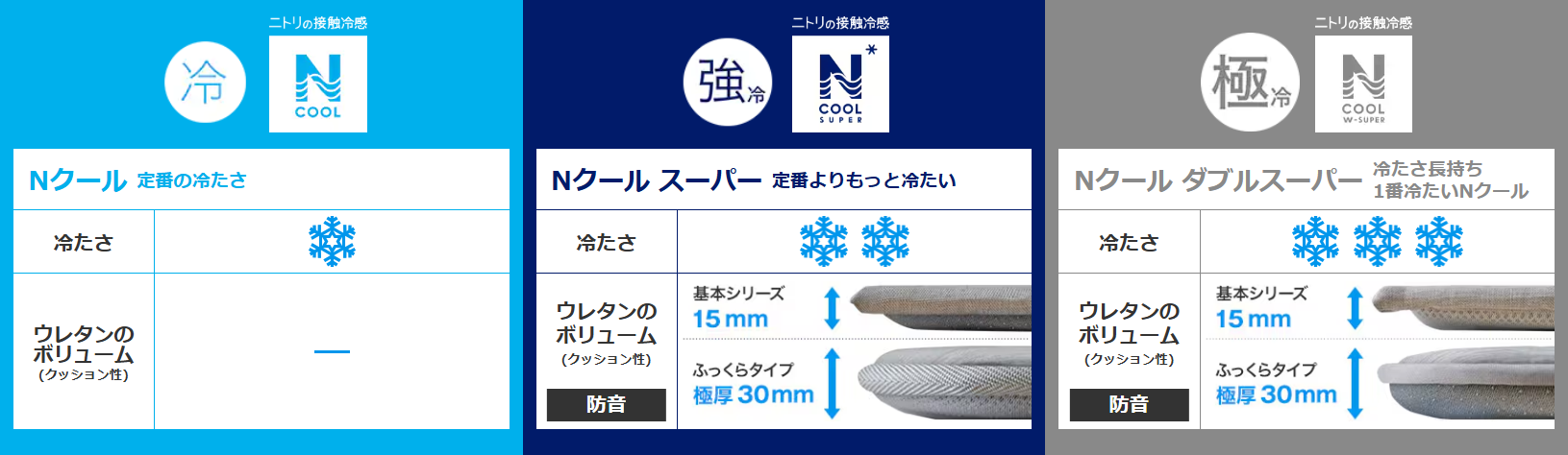 毎年「Nクール」、「Nクールスーパー」、「Nクール ダブルスーパー」の3つのレベルの冷たさでご用意していますが、今年はウレタンのボリュームからお選びいただける選択肢が増えました。