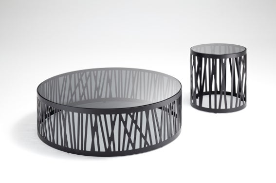 「8330」はガラスと金属の異素材を組み合わせた独創的なデザインのテーブルシリーズです。ブラック色のスモークがかかったガラス天板は12㎜の厚みがあります。