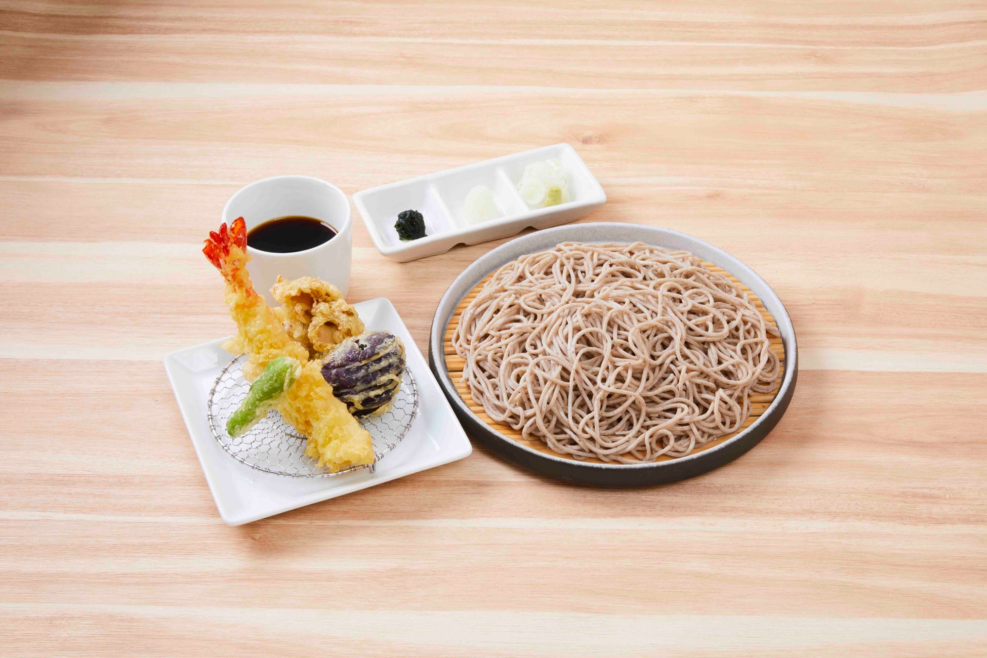 大ぶりの海老と新鮮野菜をカラッと揚げた天ぷら と二八 蕎麦を、「揚げたて」「茹でたて」でご提供いたします。また、3種(ネギ、おろし、のり)の薬味は、さらに蕎麦の愉しみを広げます。