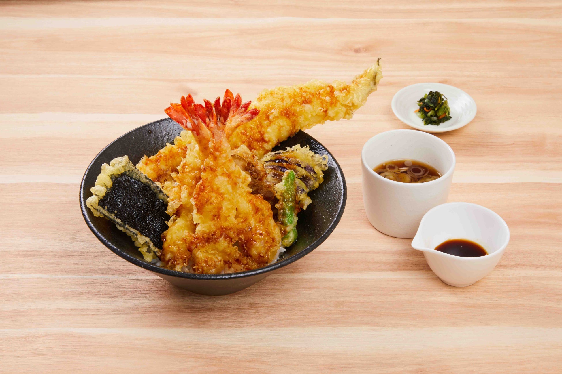 国産の活〆一本穴子天ぷらと海老3本に野菜天を盛り付けました。ゴマ油の風味をきかせた揚げたての天ぷらにタレとご飯が絡み合うボリュームのある一品です。