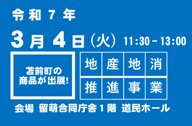 そんな留萌地域の「食」の周知と地産地消を目的に、令和7年3月4日(火)、留萌合同庁舎(留萌振興局)1階で、苫前町観光協会が出展し、「苫前町」の地元企業の各種商品を販売します。