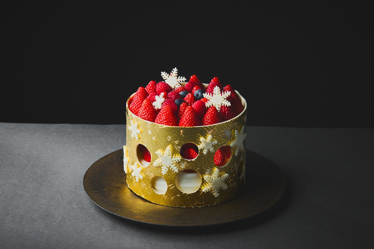 聖夜にこの上ない幸せ(Blissful)を願ってシェフがデザインしたクリスマスケーキは、大阪ステーションホテルのブランドカラーであるゴールド。パーティーの主役にふさわしい輝きを放っています。トップにたっぷりのいちごとブルーベリーやラズベリーをあしらい、側面はホワイトチョコレートにぐるりと金箔を飾りました。ところどころに開いたホールから中を覗くと、そこにはさらに、いちごとクリームをたっぷり使った、王道のショートケーキが出番を待っています。