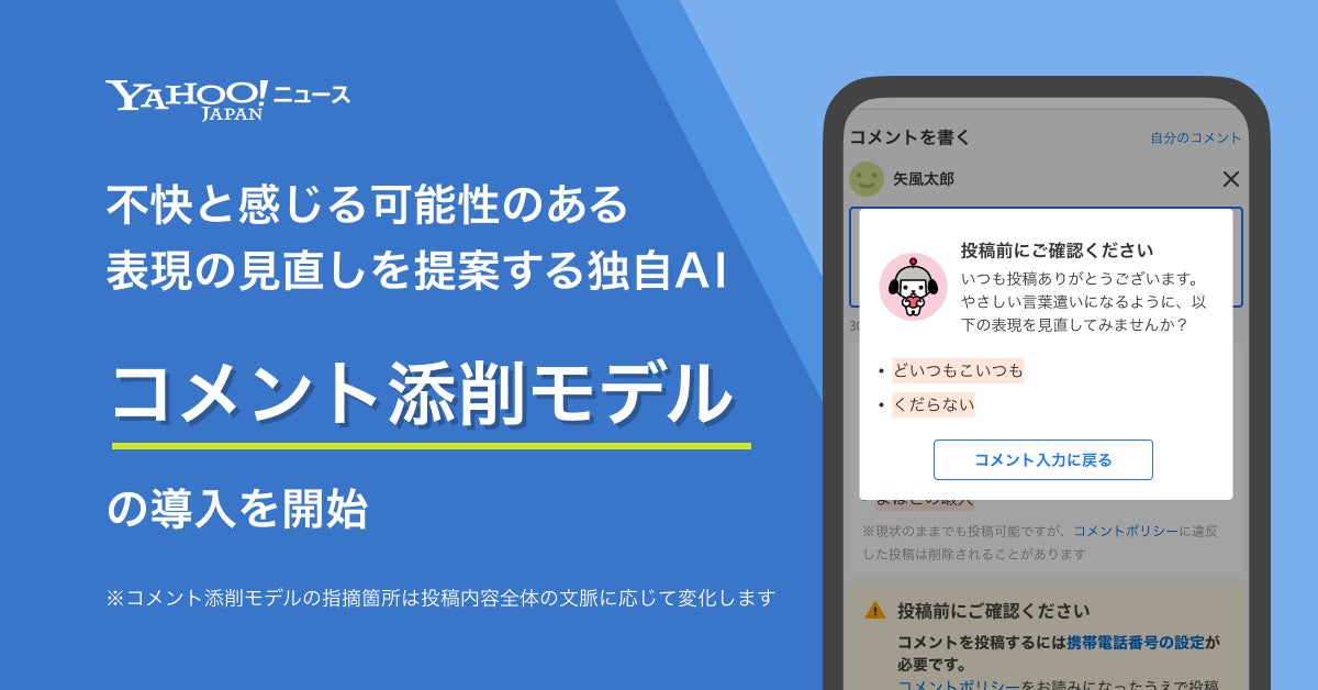 【Yahoo!ニュース】コメント欄のさらなる健全化を目指しAIが表現の見直しを提案する「コメント添削モデル」の導入を開始