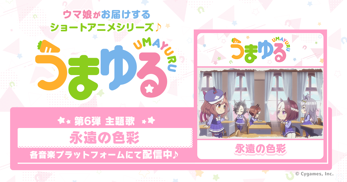 ゲームの企画・開発・運営事業を展開する株式会社Cygames(本社:東京都渋谷区、代表取締役社長:渡邊耕一)は、弊社が展開するクロスメディアコンテンツ『ウマ娘 プリティーダービー』について、新作ショートアニメシリーズ『うまゆる』の第6弾主題歌を、本日3月6日(月)より配信開始したことをお知らせします。