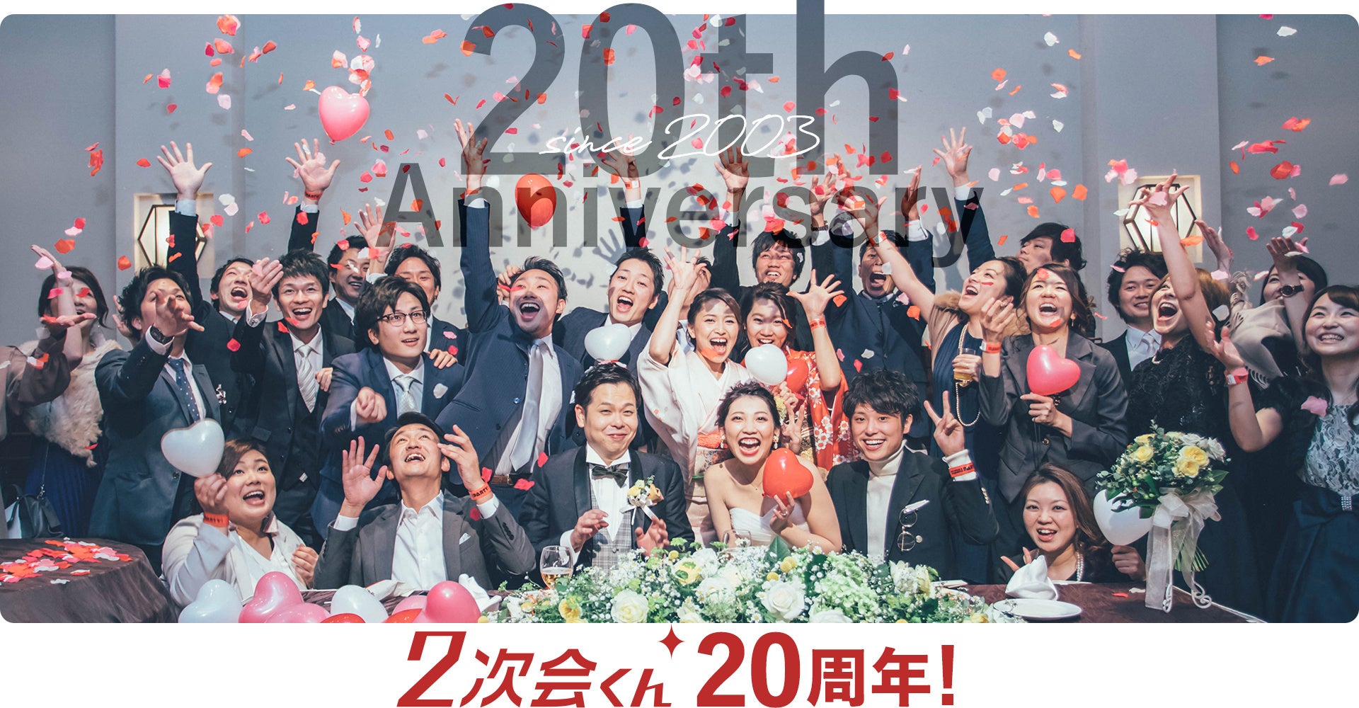 2003年6月にサービスを開始した「2次会くん」は、これまで累計30,000組の新郎新婦様にご利用いただき、おかげさまで本年6月に20周年を迎えることができました。