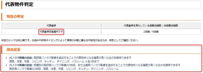 「LIFULL HOME'S」の「代表物件レポート」のデータを活用し、「いえらぶCLOUD」の管理画面内で、「LIFULL HOME'S」の賃貸カテゴリにおいて代表物件になるために必要な情報を自動で表示・提案する機能です。