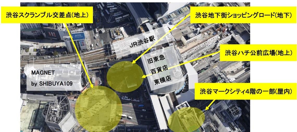 本取り組みでは、渋谷区の中でも特に人の往来や滞留が多い渋谷スクランブル交差点、渋谷駅前ハチ公前広場や渋谷マークシティおよび渋谷地下街の一部エリアを対象に5G電波環境を整備します。各場所にて、複数の携帯キャリアと通信速度、他の基地局との電波干渉や基地局間の接続切替え時の円滑な通信移行などの技術検証を行い、完了後、順次商用化していく予定です。