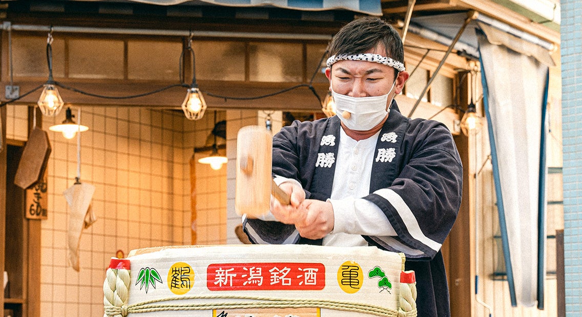 夕日の丘商店街の会長・魚海勝男さんから新年のご挨拶。振る舞い酒を行います。