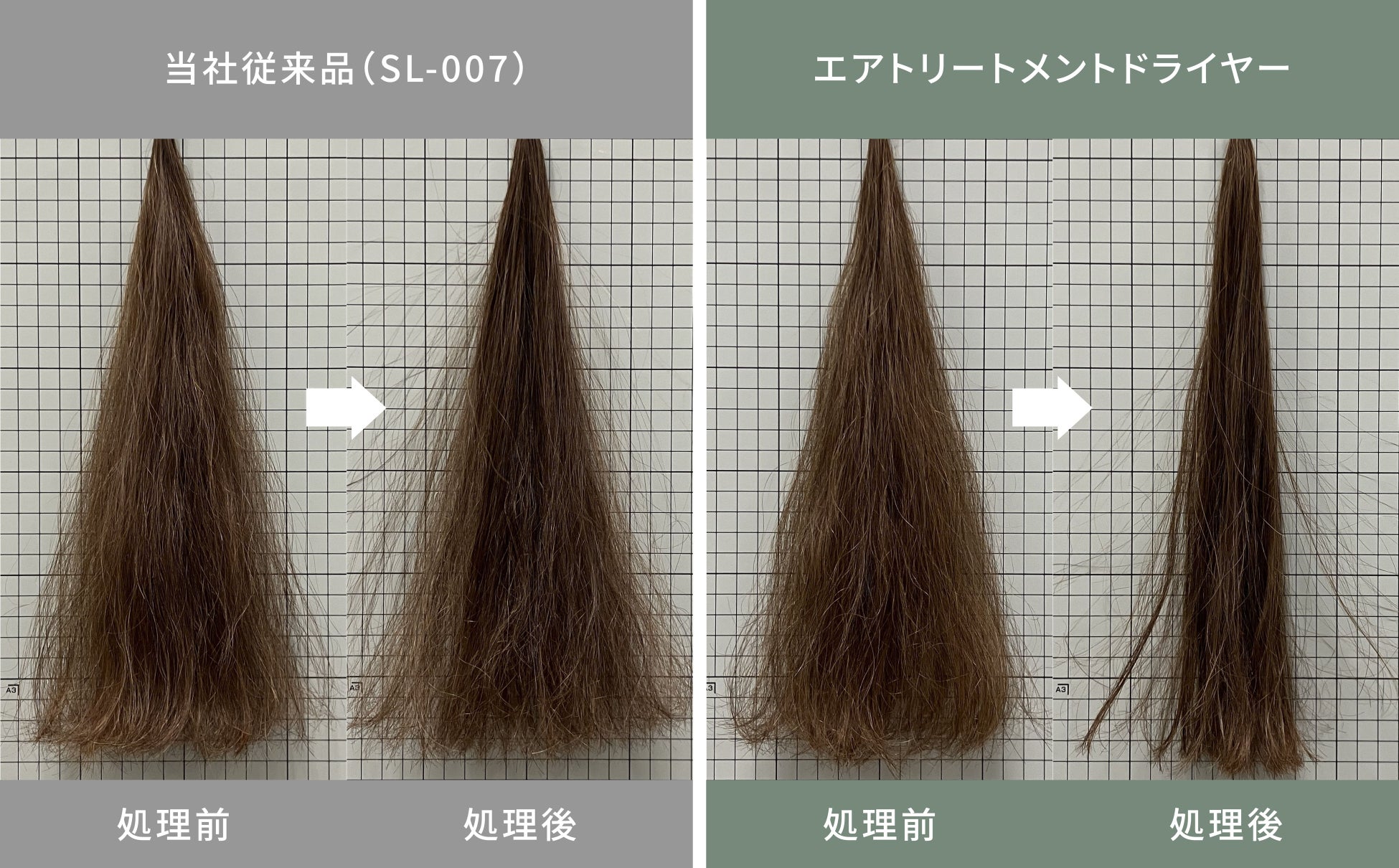*3 株式会社消費科学研究所による測定 (当社従来品 SL-007 との比較) ダメージ処理と本製品での試験品処理を施した毛束と、ダメージ処理と比較品(SL-007) での試験品処理を施した毛束による、毛髪の広がりを比較。SAL24211:GLOSS モード、SL-007:Hight。使用環境(温度・湿度など)や個人差で効果は異なります。