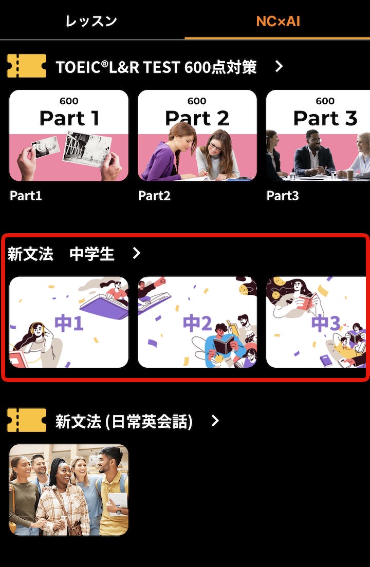 さらに、英会話だけでなく、英語学習者に必要なスキルを効率的かつ効果的に習得できる環境を整えるため、オールインワン英語学習アプリ「NC×AI」を提供しています。このたび、この「NC×AI」に新たなコンテンツ「新文法 中学生」を追加しました。