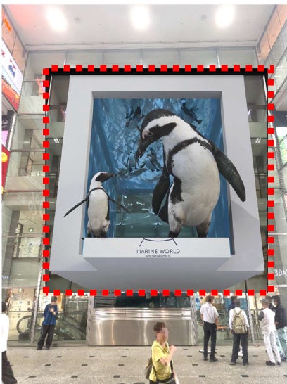 また、巨大なビジョンへ生まれ変わることを機に、「マリンワールド海の中道」とコラボした映像を制作し、当ビジョンでの放映を予定しています。ビジョンを見上げると、可愛らしいペンギンが水槽から飛び出してくるような「目の錯覚」を利用したインパクトのある映像をお届けします。待ち合わせの時間もお楽しみいただける、天神のランドマークに相応しいスポットに生まれ変わります。